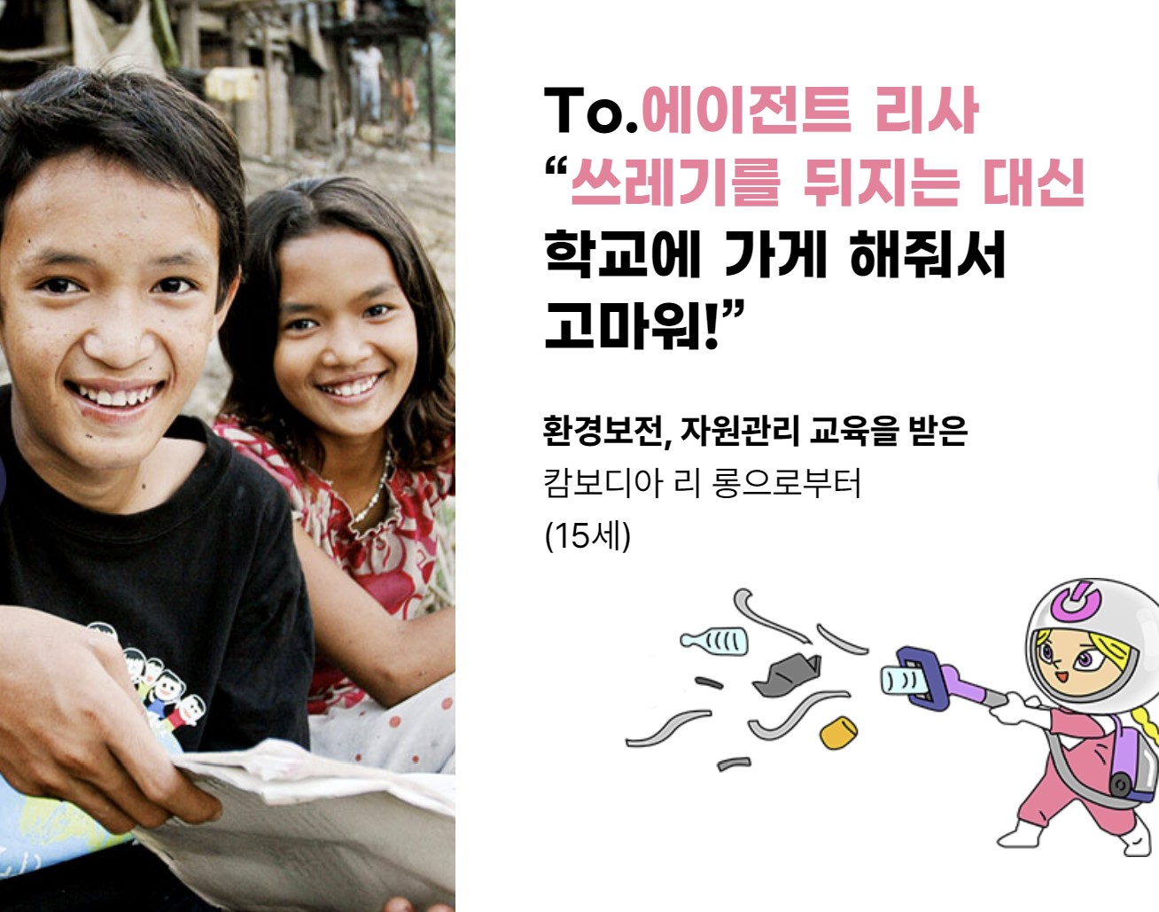 월드비전 오스틴 쓰레기장에 묻힌 꿈 쓰레기장에서 자란 14살 오스틴 쓰레기장에서 태어나 부모님이 누군지도 모른 채 버려진 오스틴에게는 쓰레기장이 세상이 전부입니다. 누구도 의지할 곳