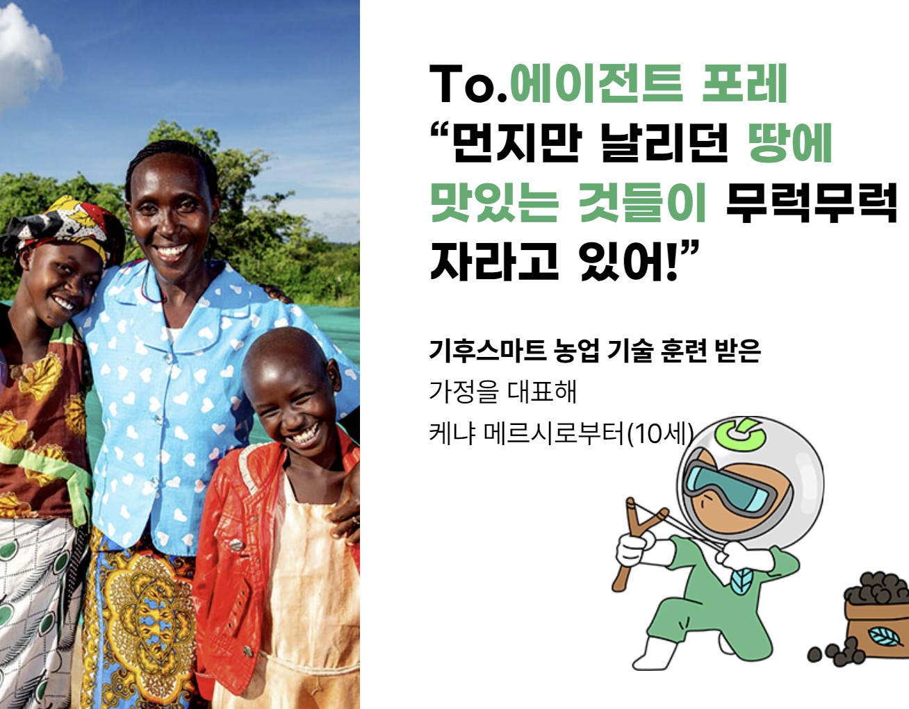 월드비전 식량위기지원 해피밀 프로젝트 최악의 식량위기 2차 대전 이후 최악의 식량위기를 마주한 아프리카. 지구온난화에 가장 책임이 없는 땅, 하지만 가장 큰 피해를 보고 있는 땅. 극심한