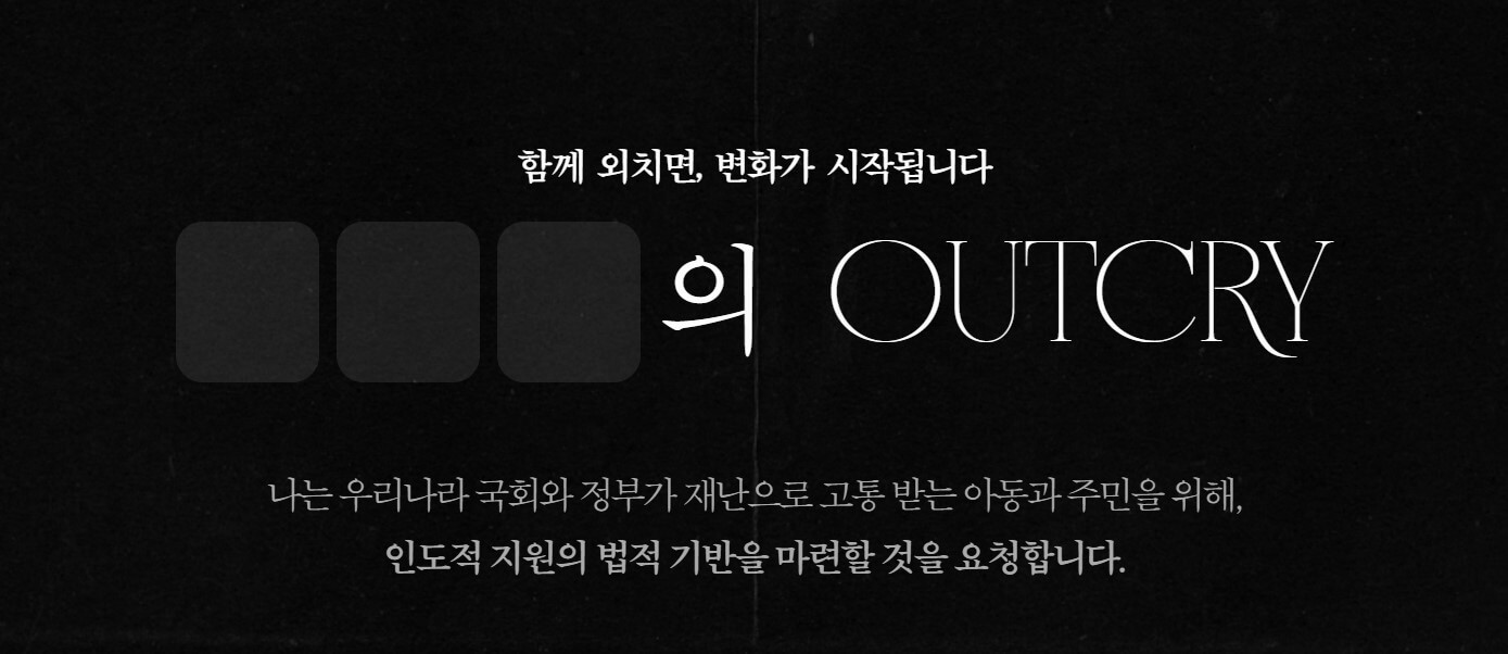인도적 지원 법적 기반을 마련하기 위해 국민청원캠페인 아웃크라이를 마련했습니다. 현재 430여 명이 국민청원에 동참했고 지속적인 참여가 이루지고 있습니다.
