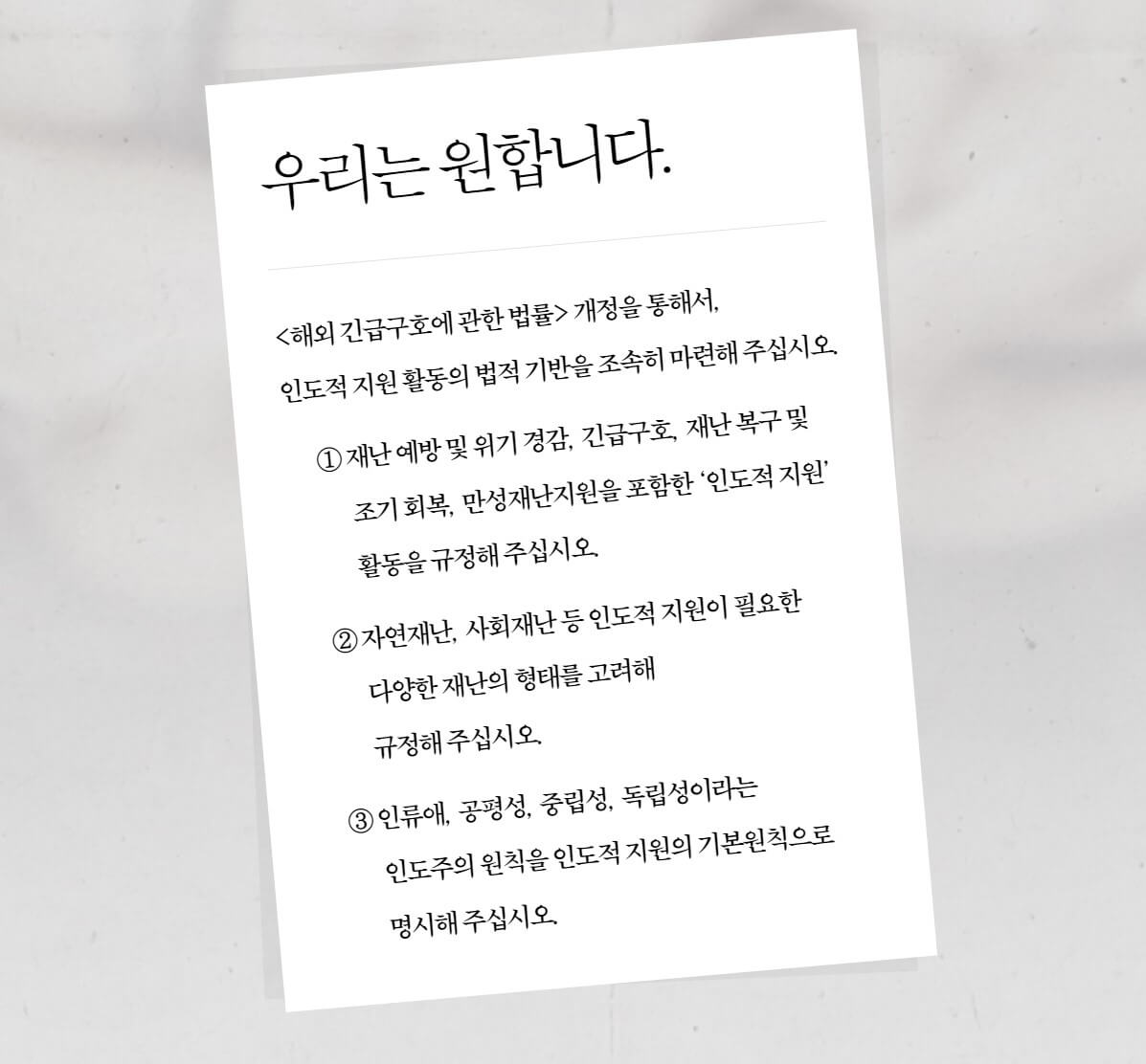 청원서는 국회 (외교통일위원회)와 정부(외교부)등에게 전달되며, 인도적 지원의 법적 기반 마련을 요구합니다. 인도적 지원이 법으로 규정되면, 우리나라가 인도적 지원을 통해 재난으로 고통받는 아동을 가장 먼저, 빠르게, 끝까지 지켜줄 수 있게 됩니다. 현재는 긴급구호에 대해서만 부분적으로 규정하고 있어 열악한 것이 사실입니다.
