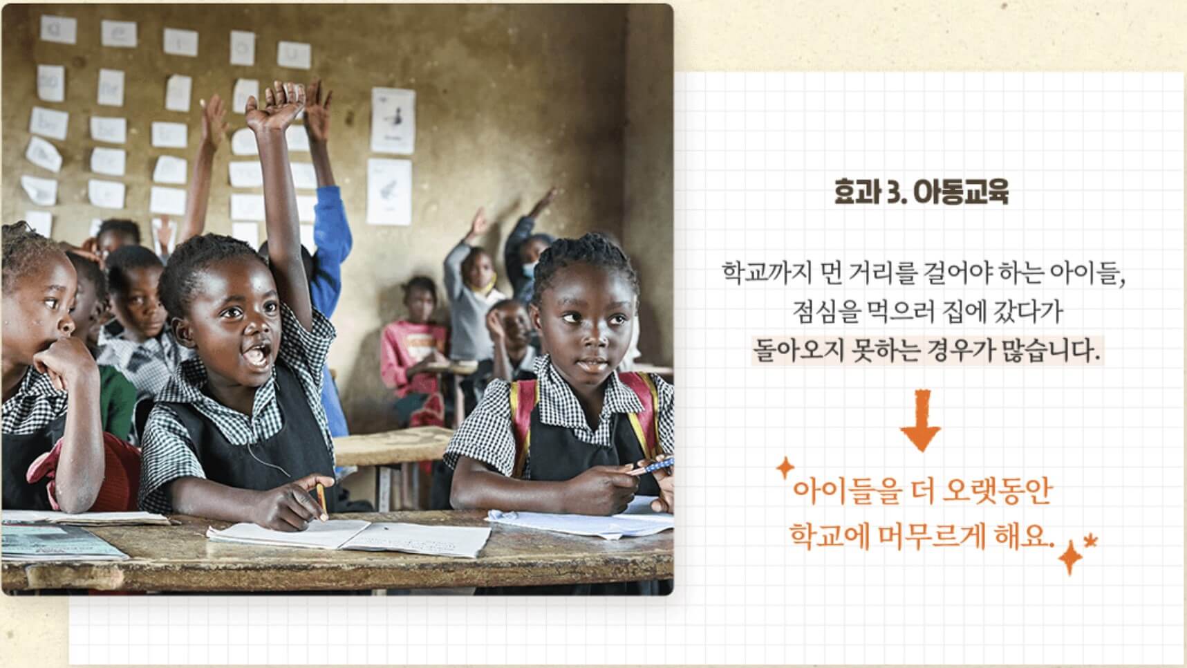 학교까지 먼 거리를 걸어야 하는 아이들, 점심을 먹으러 집에 갔다가 돌아오지 못하는 경우가 많습니다. 아이들을 더 오랫동안 학교에 머무르게 합니다.