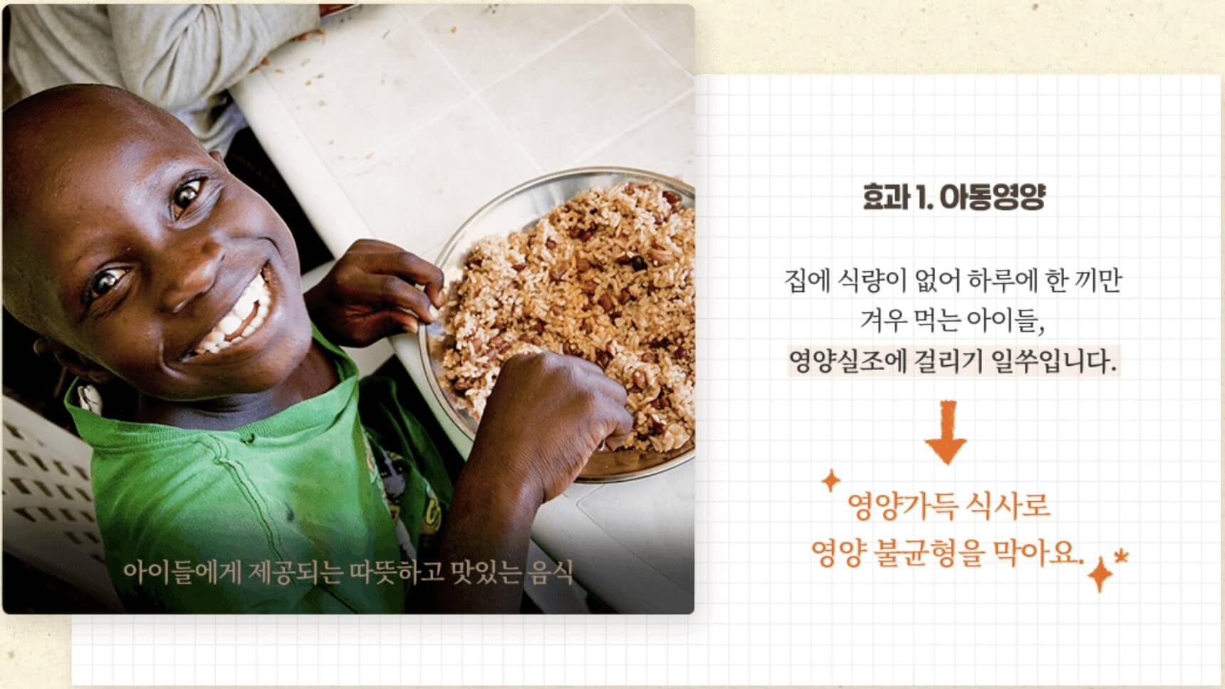 집에 식량이 없어 하루에 한 끼만 겨우 먹는 아이들, 영양실조에 걸리기 일쑤입니다. 영양 가득 식사로 영양 불균형을 막아줄 수 있습니다.
