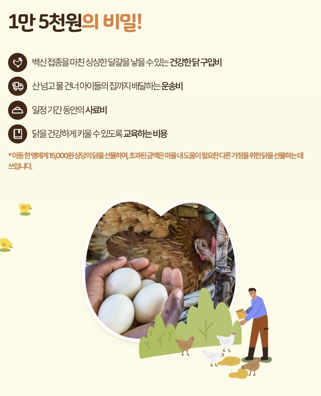 *아동 한 명에게 15,000원 상당의 닭을 선물하며, 초과된 금액은 마을 내 도움이 필요한 다른 가정을 위한 닭을 선물하는데 쓰입니다.