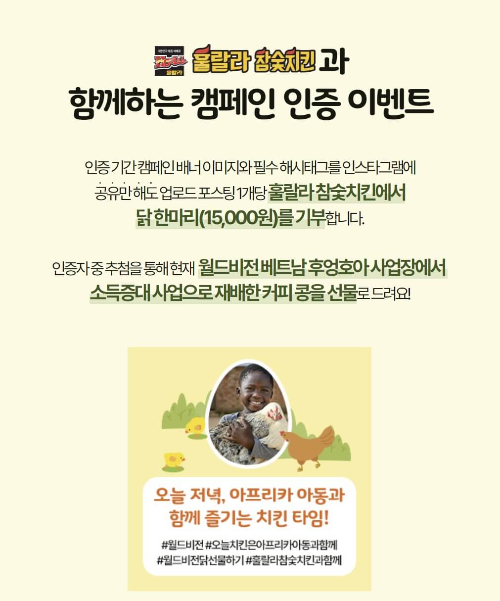 인증 기간 캠페인 배너 이미지와 필수 해시태그를 인스타그램에 공유만 해도 업로드 포스팅 1개당 훌랄라 참숯치킨에서 닭 한마리(15,000원)를 기부합니다.