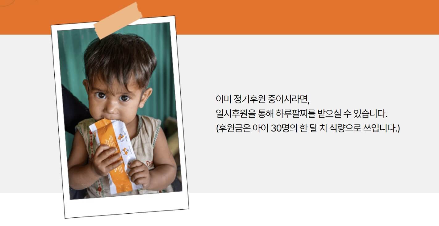일시후원을 통해 하루팔찌를 받으실 수 있습니다. (후원금은 아이 30명의 한 달 치 식량으로 쓰입니다.)